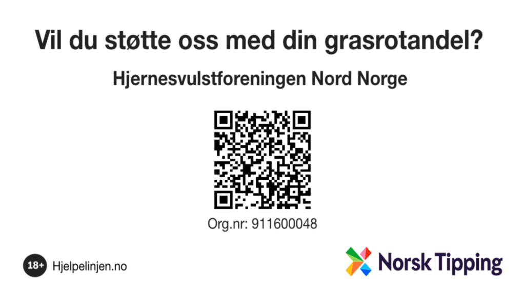 Leverer du en lottokupong eller benytter deg av andre spill fra Norsk tipping kan du helt enkelt bidra til Hjernesvulstforeningen uten at det koster noe ekstra. Hvis du skanner denne QR koden blir du registrert som grasrotgiver for regionlaget Nord-Norge.