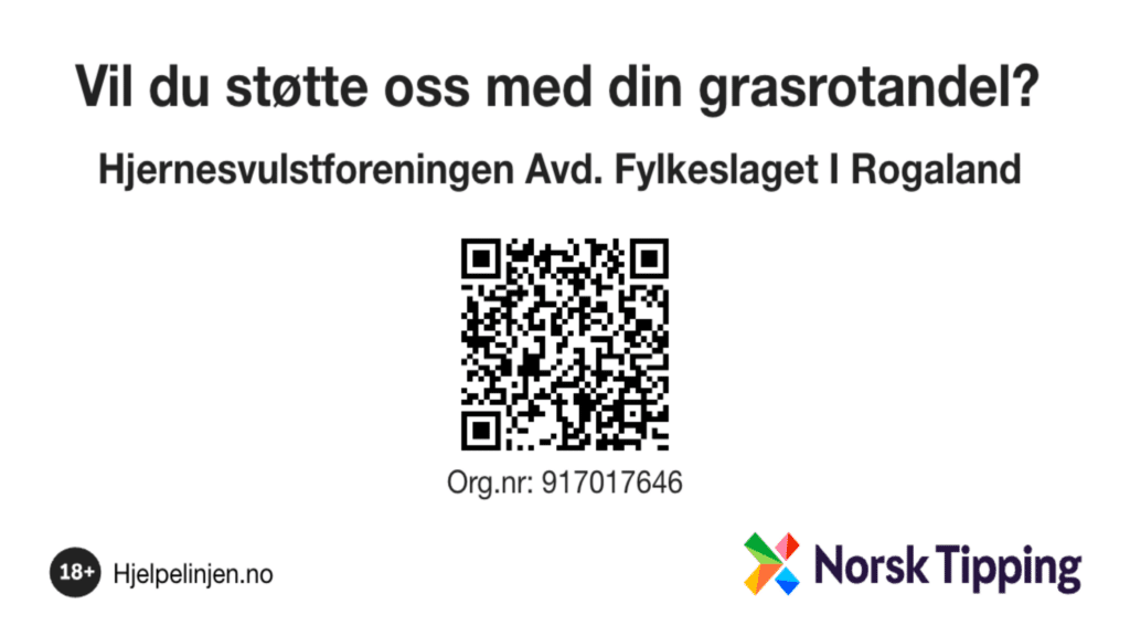 Leverer du en lottokupong eller benytter deg av andre spill fra Norsk tipping kan du helt enkelt bidra til Hjernesvulstforeningen uten at det koster noe ekstra. Hvis du skanner denne QR koden blir du registrert som grasrotgiver for regionlaget Rogaland.